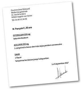 La posologie de l’aciclovir doit être modifiée : les recommandations préconisent l’administration de 200 mg cinq fois par jour (soit 1 g/j) pendant cinq jours (et non comme ici de 0,6 g/j pendant 7 jours). Le pharmacien contacte le médecin qui valide le changement. La posologie journalière maximale pour le paracétamol aurait dû être mentionnée, ainsi que le rythme d’application du Dakin.