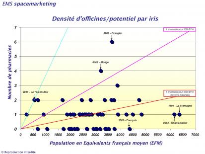 Le graphique en nuage de points visualise la position de chaque quartier-iris en ce qui concerne, d’une part, son potentiel médicament exprimé en population équivalente (EFM), en abscisse et, d’autre part, en ordonné, le nombre de ses pharmacies. On voit que :