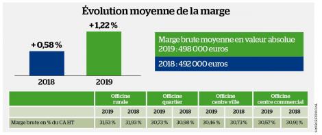 En ce qui concerne le taux de marge brute rapportée au chiffre d’affaires hors taxes, constate-t-on en 2019 des différences selon les typologies d’officines ?
