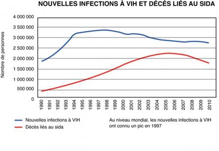 Le nombre de personnes vivant avec le VIH dans le monde était estimé à 34 millions à la fin de 2010, soit une hausse de 17 % par rapport à 2001 et un niveau jusque-là jamais atteint, qui s’explique essentiellement par un meilleur accès aux traitements. « Les gens vivent plus longtemps et les décès dus au sida chutent », souligne l’ONUSIDA. Près de 2,5 millions de décès ont ainsi été évités dans les pays à revenu faible et intermédiaire. Dans le monde, le nombre de morts liés au sida est passé de 2,2 millions en 2005 à 1,8 million en 2010.