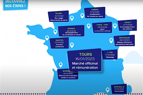 Dans 11 villes, la Fédération des syndicats pharmaceutiques de France (FSPF) ira à la rencontre des pharmaciens, de leurs équipes et des étudiants. Symboliquement, c'est dans les facultés de pharmacie de ces villes que le syndicat a choisi de présenter les nouvelles lignes pour la profession de demain. L'objectif de ce tour de France, dont le coup d'envoi sera donné le 3 octobre en présence de Thomas Fatôme (directeur général de la CNAM) et de Marguerite Cazeneuve (directrice déléguée de l'assurance-maladie), est de décrypter et d'exposer les implications de la convention pharmaceutique signée le 9 mars entre les deux syndicats représentatifs de la profession et l'assurance-maladie. De plus, une conférence abordant un thème différent dans chaque ville, en présence d'un expert, sera proposée : exercice coordonné, marché officinal et rémunération, dépistage, enjeu écologique, vaccination, accompagnement des patients, réseau officinal et permanence des soins, bon usage des produits de santé, amélioration de l'accès aux soins ou encore développement du numérique.