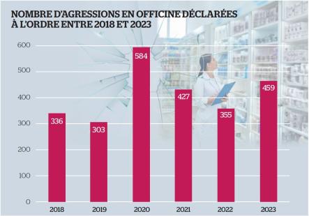 En 2023, 475 pharmaciens (dont 97 % d’officinaux) ont déclaré une agression à l’Ordre, soit une moyenne d’environ 40 déclarations par mois. Un chiffre en hausse de près de 30 % comparé à 2022 et de 40 % par rapport à il y a cinq ans. Si l’on excepte l’année 2020, au début de la crise du Covid-19, le nombre de signalements n’a jamais été aussi élevé depuis 5 ans. La majorité des faits dénoncés par les officinaux concerne des menaces, des injures ou encore des agressions physiques principalement motivées par des refus de dispensation, mais aussi par des difficultés de prise en charge ou des pénuries de produits de santé. L’année 2023 a aussi été marquée par les émeutes urbaines qui ont embrasé plusieurs villes du pays entre les mois de juin et de juillet. Durant cette période, de nombreux bâtiments et services ont fait l’objet de dégradations et les pharmacies et les laboratoires de biologie médicale n’ont pas été épargnés. Plus de 60 d’entre eux ont été ciblés pendant ces émeutes mais seulement 26 l’ont officiellement déclaré. À noter que sur l’ensemble de l’année 2023, trois régions concentrent près de la moitié des agressions déclarées : l’Île-de-France (environ 16 % des cas), Auvergne-Rhône-Alpes (près de 15 %) et Nouvelle-Aquitaine (plus de 12 %). Enfin, dans 3 % des cas au niveau national, l’agresseur était en possession d’une arme (blanche ou à feu).