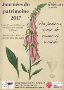 Journées européennes du patrimoine à la faculté de pharmacie, 4 avenue de l’Observatoire, Paris 5e, samedi 16 septembre 2017. Visites commentées de 10 heures à 19 heures : du hall d’honneur et du jardin botanique ; de la Salle des Actes et de la Galerie des Pots ; du musée François Tillequin avec présentation d’ouvrages de la bibliothèque.