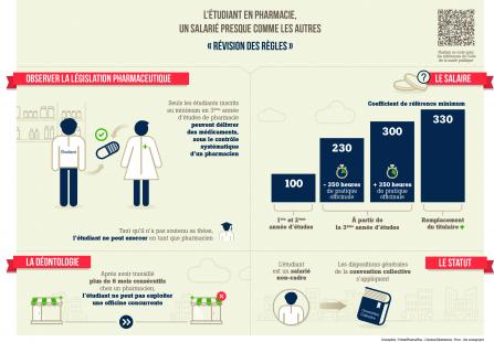 Dès son inscription en 3e année, l’étudiant en pharmacie peut délivrer des médicaments, sous le contrôle d’un pharmacien. Cette surveillance doit être systématique, même lorsqu’il s’agit de délivrer un médicament non soumis à prescription. Tant que l’étudiant n’a pas soutenu sa thèse, il n’est pas assimilable à un pharmacien adjoint. Avant la 3e année, l’étudiant peut être affecté à différents postes comme le déballage et le rangement des commandes, la mise en rayons, la gestion des stocks, la vente de la parapharmacie et de tous les produits qui ne relèvent pas du monopole.