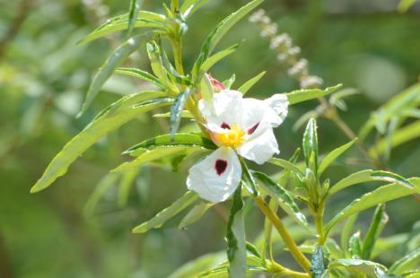 Le ciste ladanifère (Cistus ladaniferus L., Cistacées) est un arbuste du bassin méditerranéen, atteignant les 2,5 m de haut et appréciant les biotopes arides et bien ensoleillés. Il porte des feuilles allongées persistantes et collantes au toucher car elles secrètent une résine parfumée appelée le labdanum. Ses fleurs odorantes sont formées de cinq pétales chiffonnés blancs avec une tache rouge violacé à la base qui donneront des capsules résistantes aux incendies.