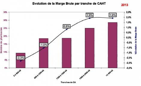Le coût d’achat des marchandises, quant à lui, baisse significativement, de 3,10 %. Cela signifie normalement une augmentation de la marge en taux, du fait de la forte hausse du marché des génériques en 2013. Toutefois, en valeur, la marge commerciale des officines reste identique en 2013 à ce qu’elle était en 2012, avec un montant moyen de 451 000 euros.
