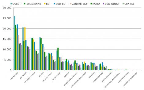 Les classes les plus couramment prescrites varient énormément en fonction des régions (voir graphique). Les médicaments pour le système nerveux, par exemple, sont fortement prescrits dans l’Ouest, la région parisienne et le Sud-Est. En revanche, ils le sont environ deux fois moins dans le Centre, le Sud-Ouest et le Nord. L’Ouest et l’Est concentrent la majorité des prescriptions de médicament pour l’appareil cardio-vasculaire, tandis que la région parisienne et l’Ouest sont en tête pour les prescriptions concernant l’appareil digestif et le métabolisme, ainsi que l’appareil respiratoire.