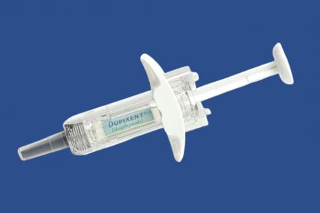 Dupixent est un anticorps monoclonal humain qui inhibe la signalisation de deux facteurs de l’inflammation : l’interleukine 4 (IL-4) et l’interleukine 13 (IL-13). Il est indiqué dans le traitement de l’asthme, mais aussi de la dermatite atopique modérée à sévère et de la polypose naso-sinusienne. Il s’administre par injection sous-cutanée en alternant les sites d’injection. Chez l’enfant de 6 à 11 ans, la dose de Dupixent est fonction du poids et Dupixent se présente en seringue préremplie.