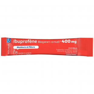 Principe actif essentiel. Ibuprofène (AINS) 200 et 400 mg en suspension buvable en sachet édulcorée au maltitol liquide.